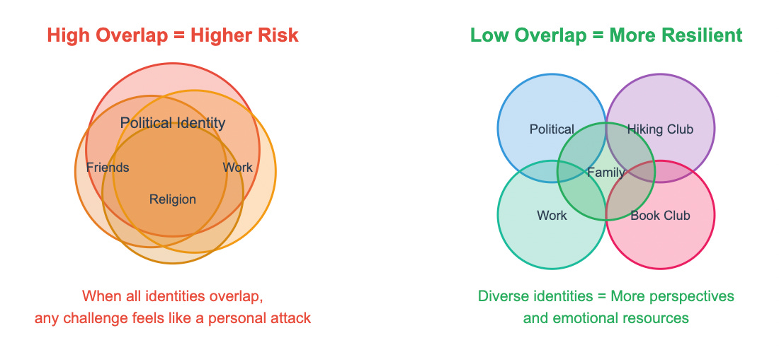 Matthew's concept of "social identity complexity" is genius. Basically, if all your identities overlap (your politics = your religion = your friend group = your job), you're super vulnerable to misinformation.